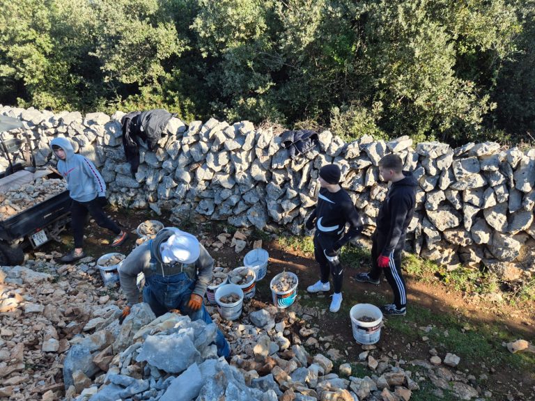 We trained a group of students from “Tehnička škola Zadar” to repair damaged dry stone wall and we repaired one damaged dry stone wall at island of Olib. Project supported by “Vodovod”d.o.o. and “Miatours”